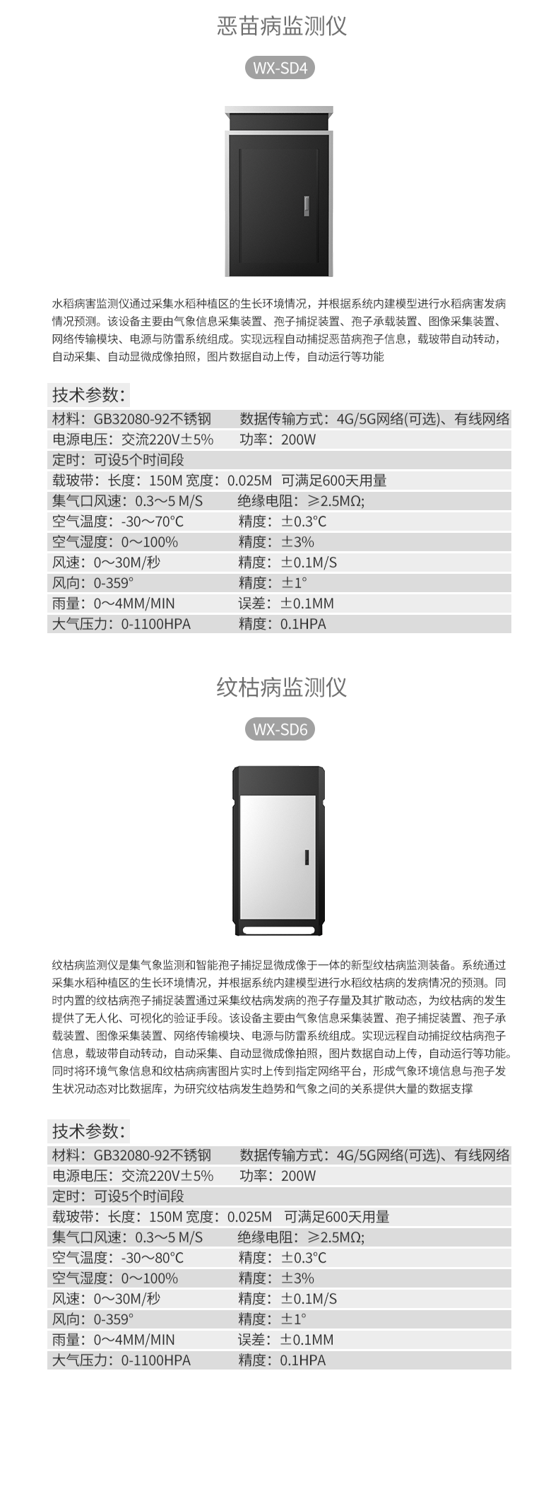 9. 可實時監測空氣溫濕度、大氣壓、風速、風向、雨量等多項稻瘟病監測指標,通過系統內部的稻瘟病模型進行發病預測。